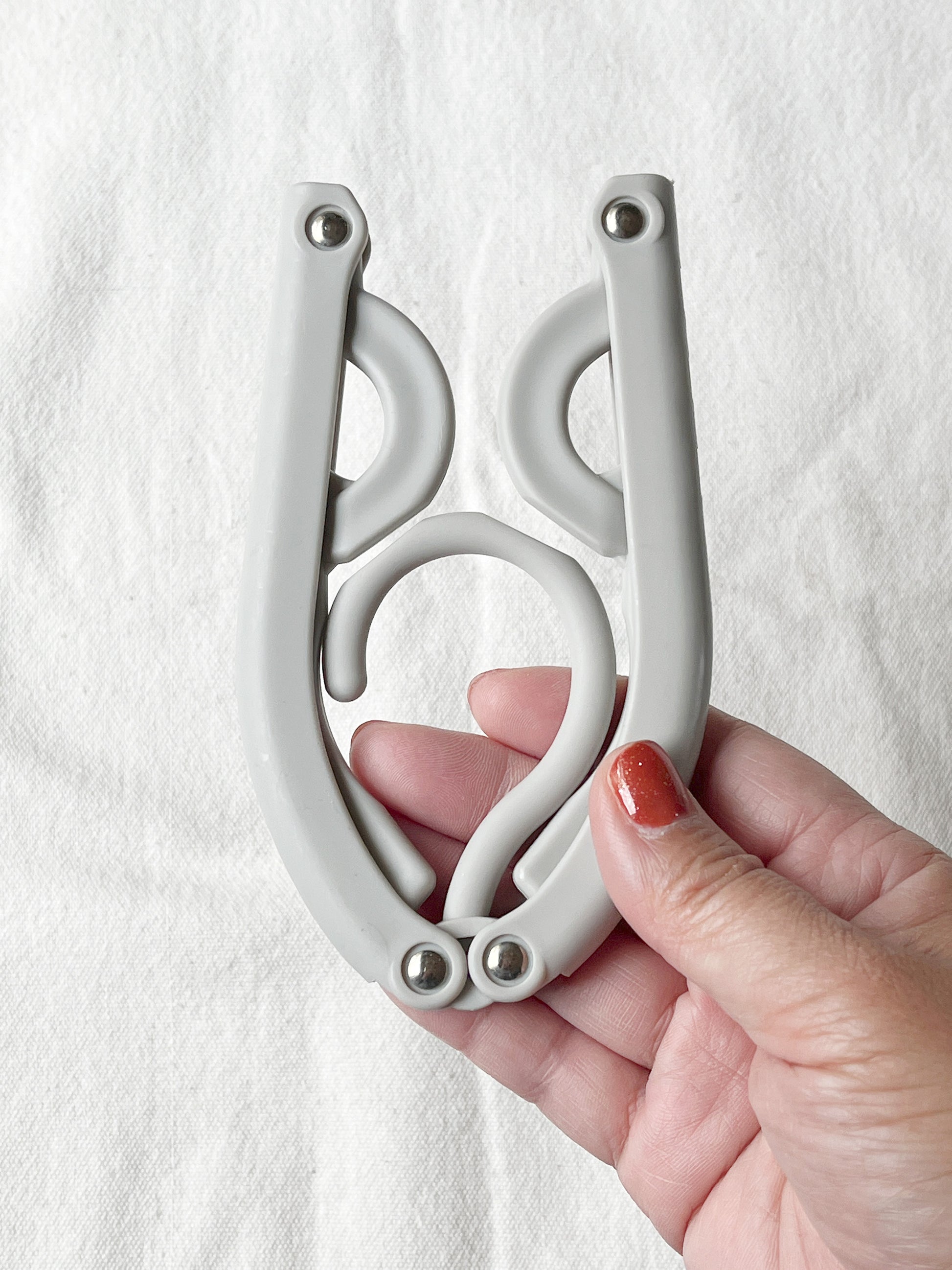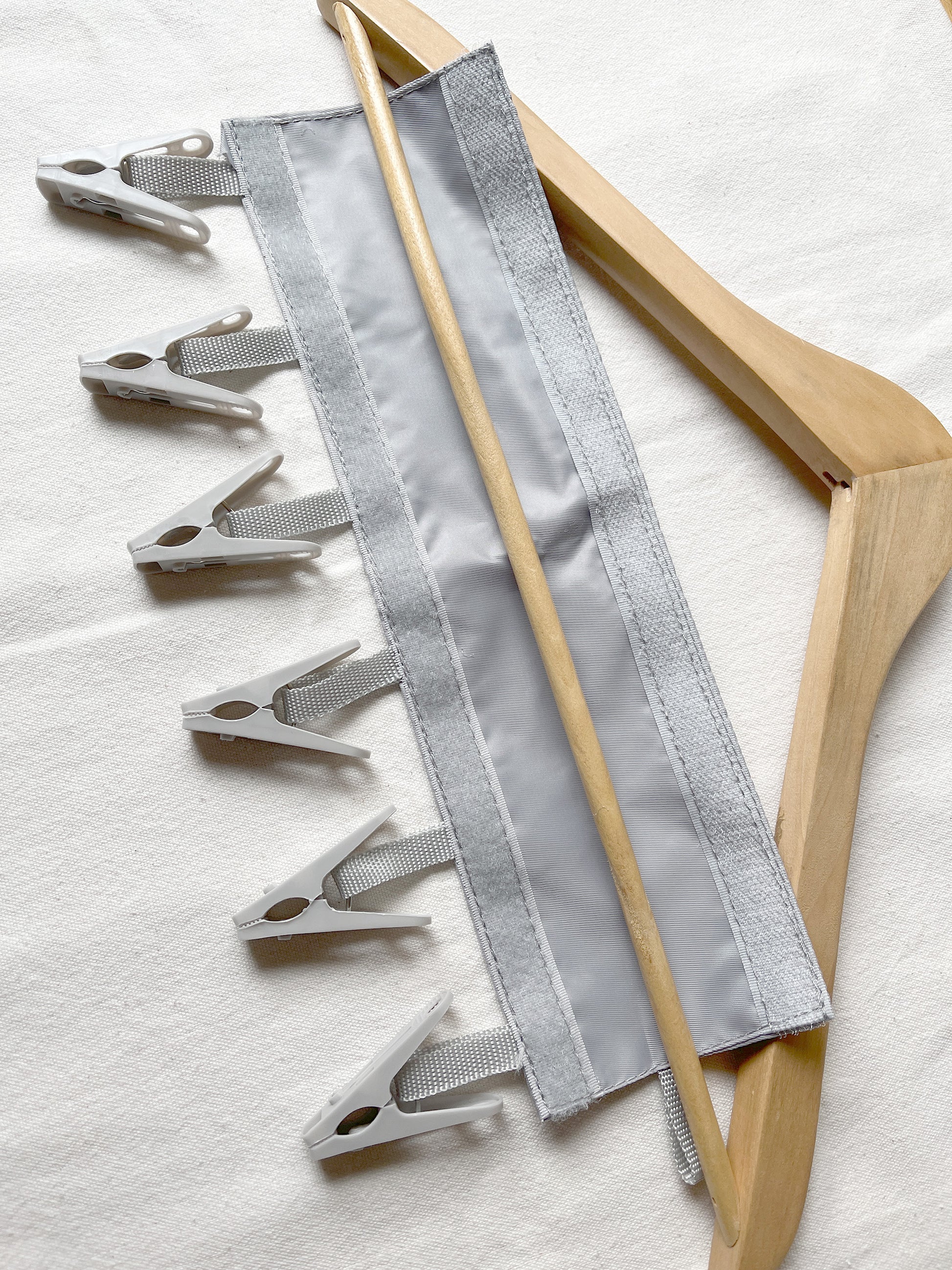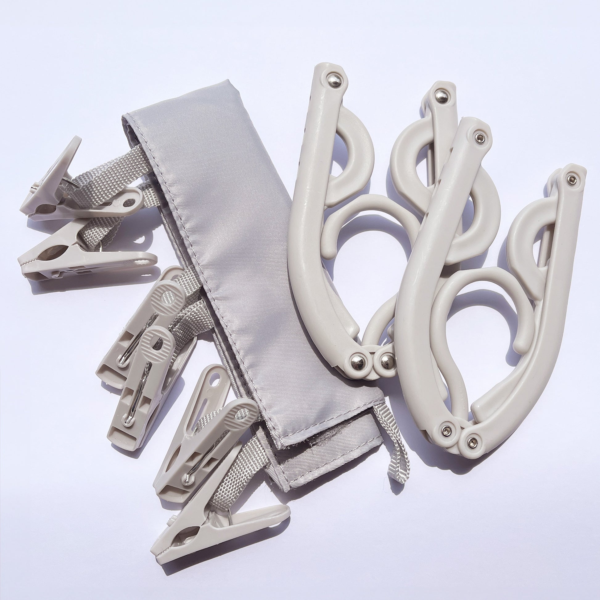 コンパクトに折りたためるハンガーと、6個のピンチ付きのベルトがセットになった「旅する洗濯ハンガー&ピンチ」。