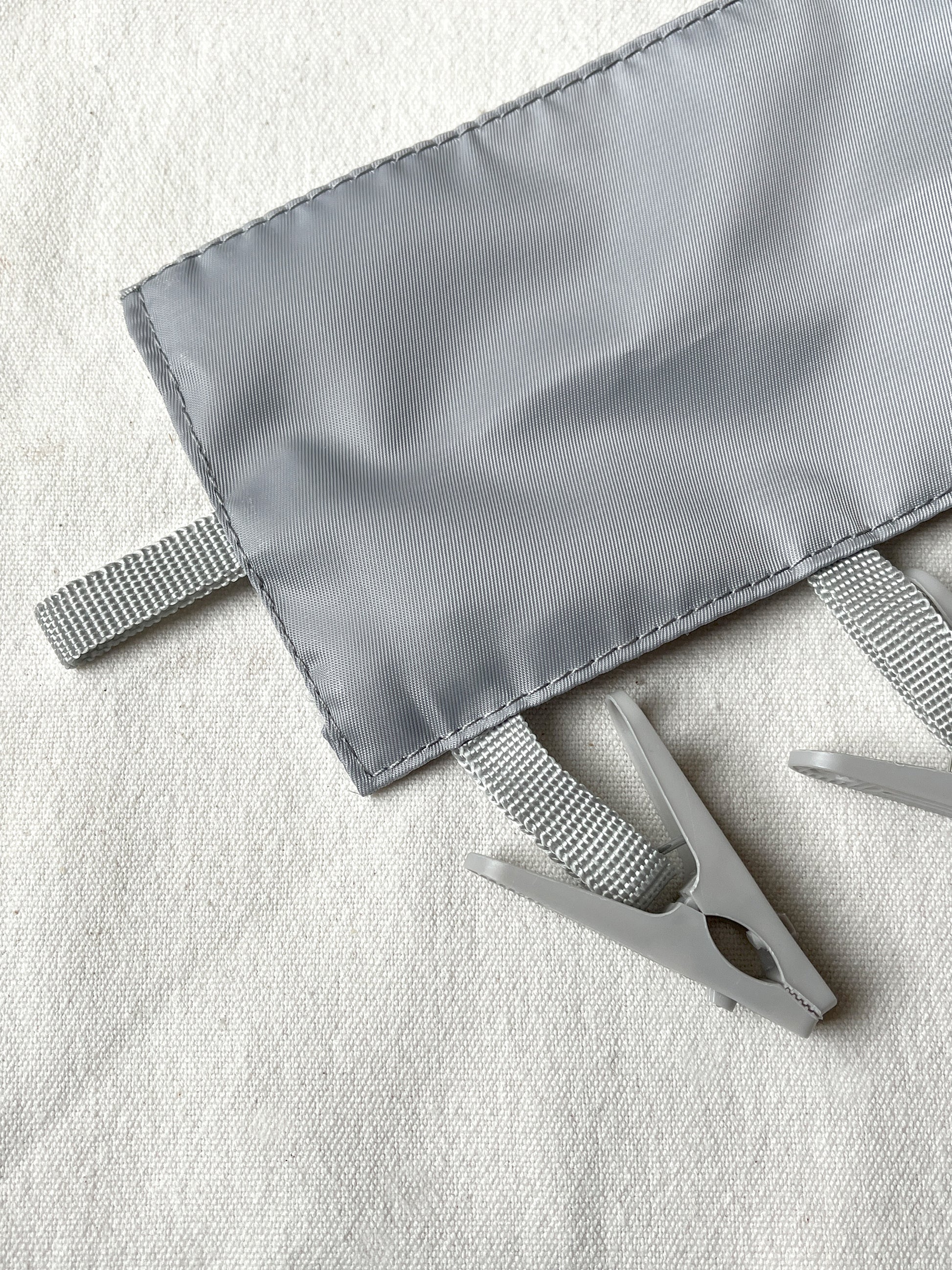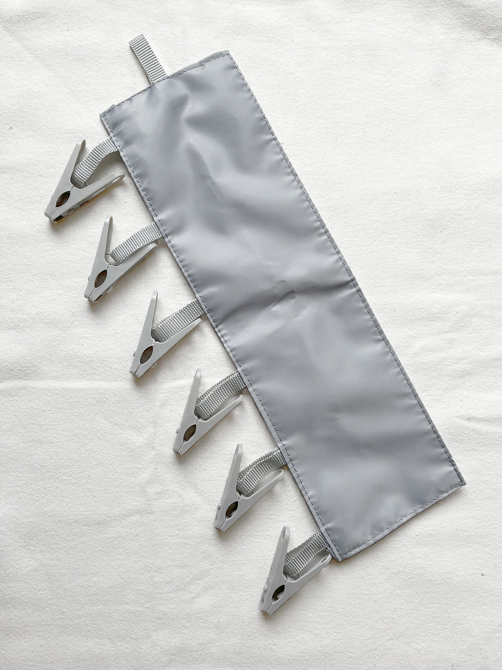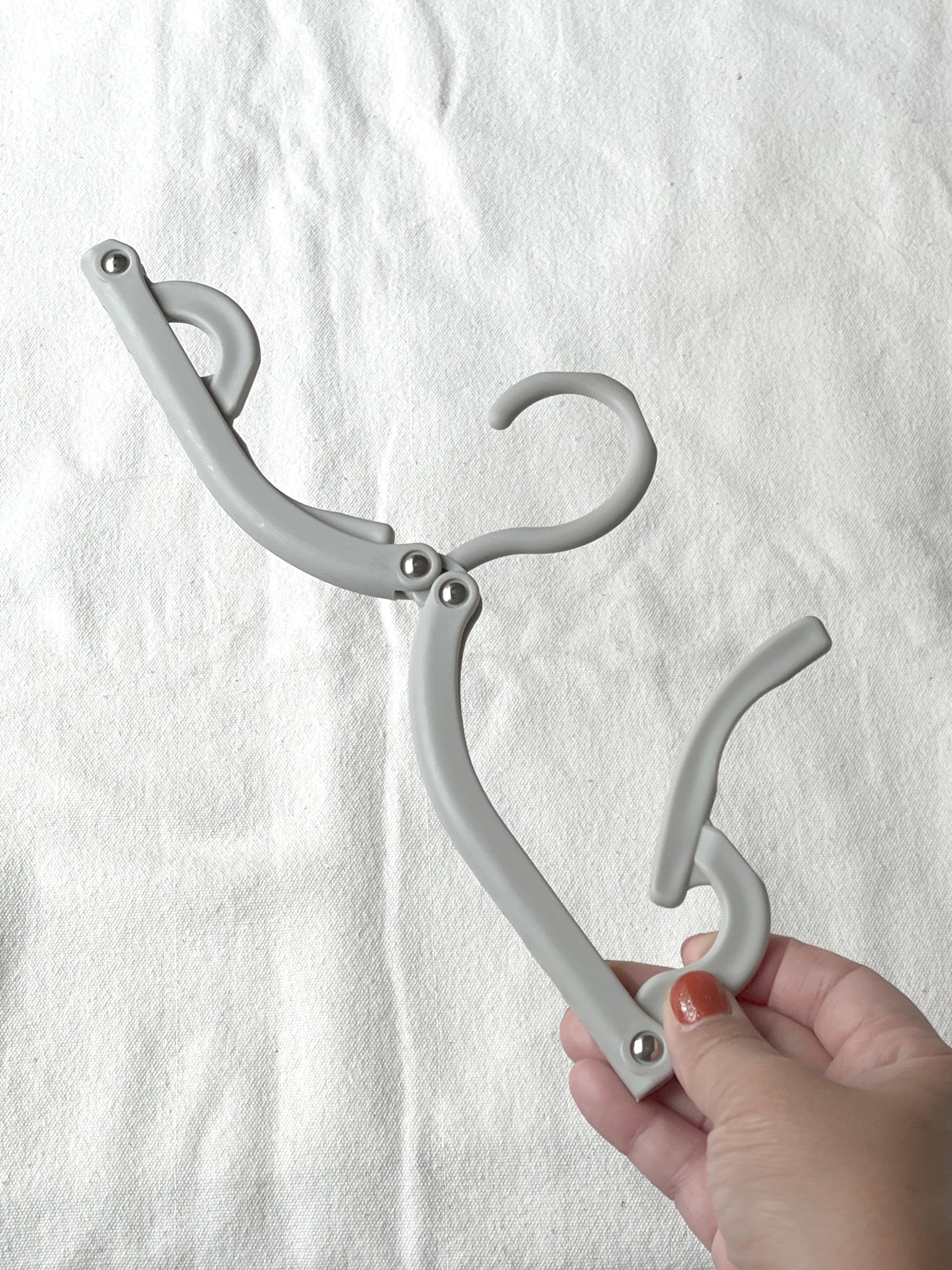 コンパクトに折りたためるハンガーと、6個のピンチ付きのベルトがセットになった「旅する洗濯ハンガー&ピンチ」。