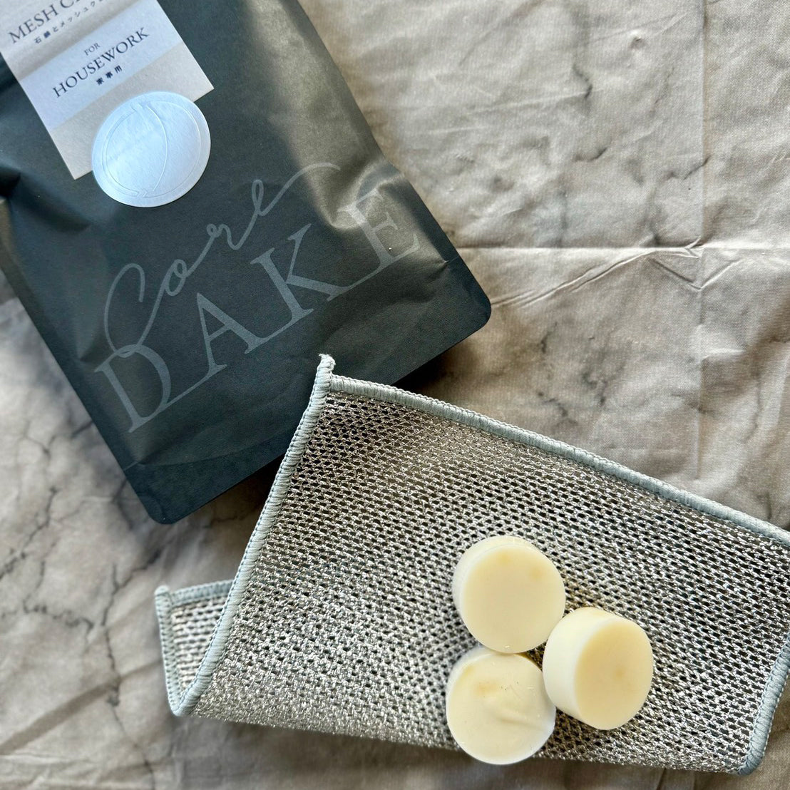 家事用石鹸とメッシュクロスをセットにした、ささやかなギフトです。
